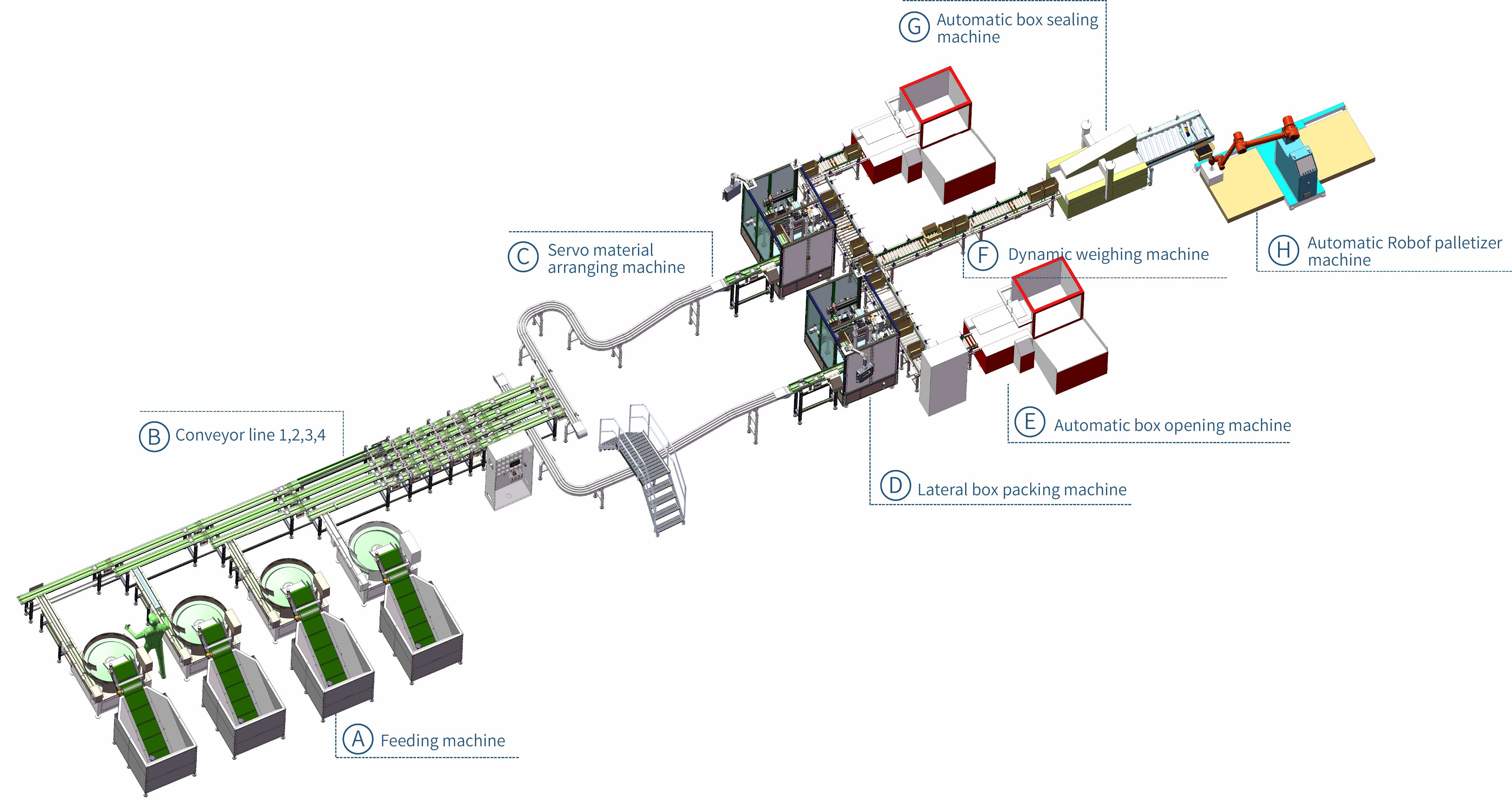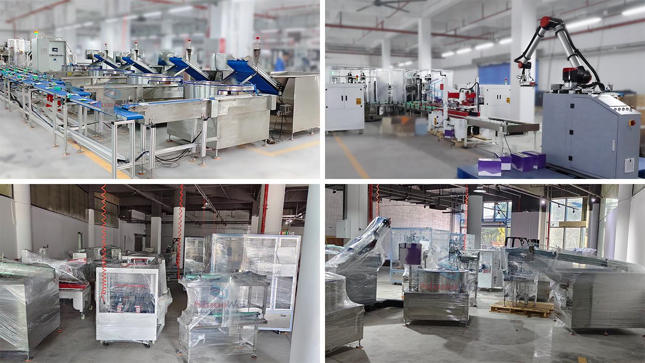 Esse Embalagem automática de alimentos r Automatiza completamente o processo de triagem, posicionamento e encaixotamento de produtos, sendo compatível com diversas especificações de produtos e embalagens. Com estrutura compacta e operação simples, é ideal para linhas de produção nas indústrias alimentícia, de produtos químicos de uso diário, de comércio eletrônico e outras. Reduz significativamente a intervenção manual, melhora a precisão e a eficiência do encaixotamento e auxilia as empresas na modernização de suas linhas de embalagem automatizadas. EXPOSIÇÃO DE MÁQUINAS