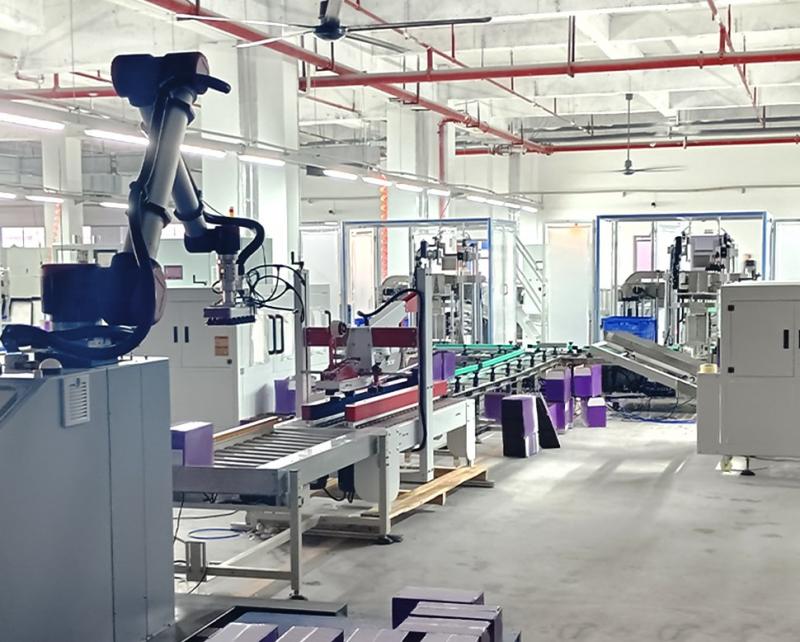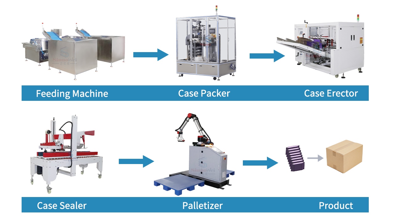 A linha automática de embalagem de alimentos permite a automação completa do processo, desde o ensacamento até o encaixotamento e paletização. Os operadores precisam apenas despejar os produtos alimentícios na bandeja de alimentação, e o equipamento realiza automaticamente tarefas como alinhamento do material, encaixotamento, selagem e paletização. Isso aumenta significativamente a eficiência da produção, reduz os custos de mão de obra e garante um processo de embalagem rápido, estável e padronizado.